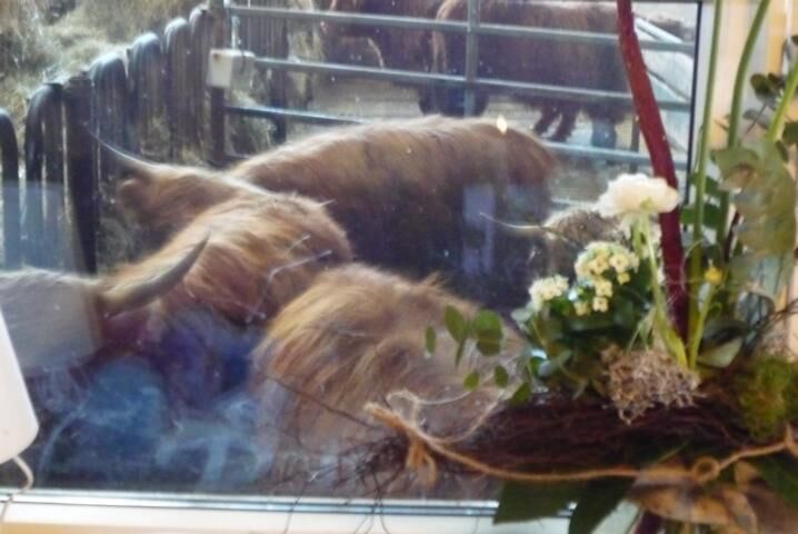 Blick aus dem Hofcafé in den Stall mit dem Harzer Rotes Höhenvieh.