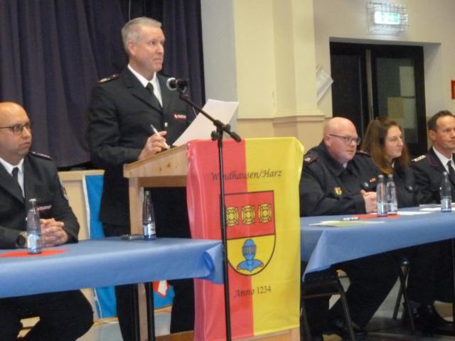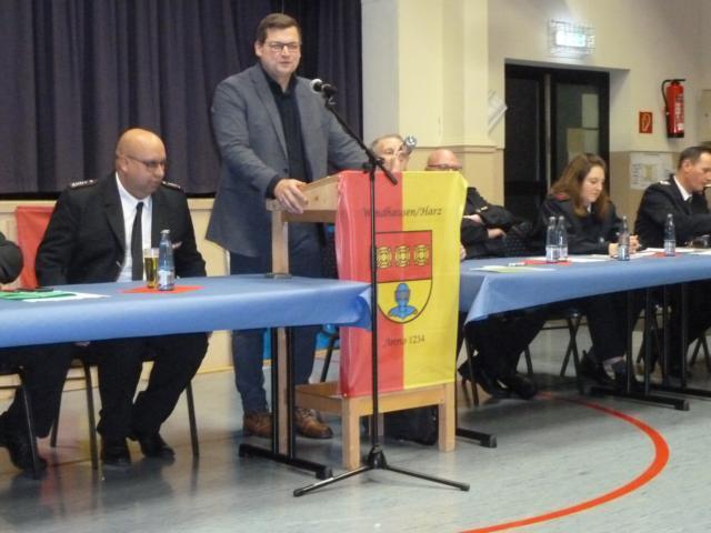 In seinem Gru゚wort berichtet stellvertretender Gemeindebrandmeister Dirk Blanke über die gute Ausbildung, auf die Langzeit-Projekte der Feuerwehr und auf die Ersatzbeschaffung der Einsatzfahrzeuge für die Wehren in Badenhausen und Eisdorf. 161 aktive Mitglieder gehören der öttlichen Wehren in der Gemeinde Bad Grund an. 1039 Einwohner fördern die Feuerwehren. Er stellt weiter fest, dass die Zusammenarbeit der Wehren gut sei.