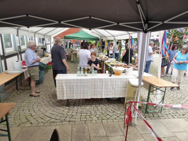 Vor dem „Alten Rathaus“ und vor dem Nebengebäude waren Verkaufsstände aufgebaut. Dort wurden zu Kaffee schmackhafter Kuchen und die stets zum Johannisfest gebackenen Eierkränze gereicht. Weiter gab es ein großes Angebot an Kaltgetränken und einen Grillstand für Bratwurst, Steaks und die von der Johannigemeinde „Adeles Eck“ einst kreierten Johanniburger. Eingelegter Harzer Käse fand viele Abnehmer. Er nach überlieferten Rezept eingelegt und mundeten allen sehr.
