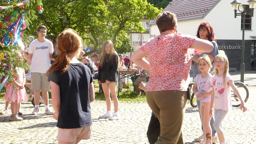 Bad Grund (kip) Um einen schmucken Johannisbaum, der erst am Tag zuvor von vielen eifrigen Ehrenamtlichen auf dem St. Antoniusplatz zwischen der mächtigen Kirche und dem ehrwürdigen „Alten Rathaus“ aufgestellt ist, wurde sehr schön geschmückt. Der Johannibaum wird für einige Zeit neben dem Zwergenbrunnen „König Hübich“ ein begehrtes Fotoobjekt sein.