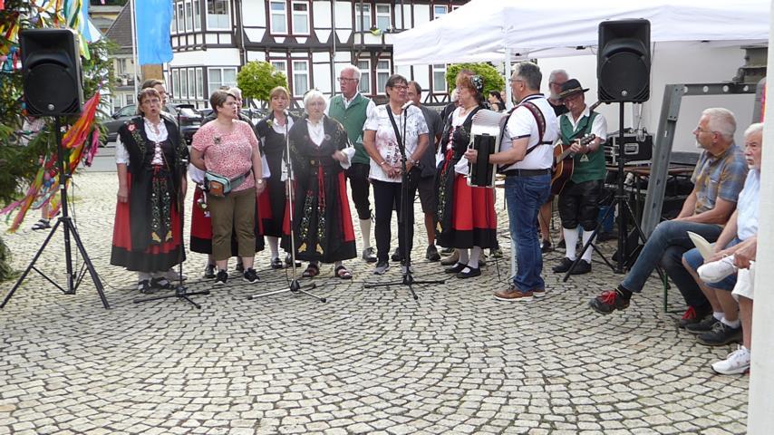 Am Abend fand sich die Brauchtumsgruppe „Harzer Roller“ des örtlichen Harzklubs ein. Überwiegend zeigten die Mitglieder der Brauchtumsgruppe sich in ihrer wertvollen Tracht. In einer kurzen Begrüßung betonte Harzklub-Vorsitzender Bodo Probst, daß die Sängerschar in ihrer Tracht seit März 2020 wegen Corona-Zwangspausen nicht aufgetreten war und heute erstmals nach zwei Jahren in der Öffentlichkeit wieder in Erscheinung tritt.