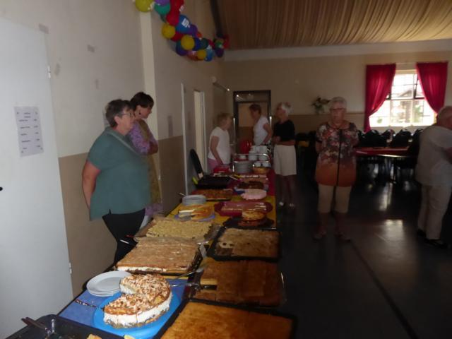 Das Team um Petra de Vries hielt ein umfangreiches Kuchenbufett mit duftendem Kaffee bereit. Viele nutzten die Sitzgelegenheit mit Tischen unter dem großen Partyzelt im Schatten der Dorfgemeinschaftsanlage.