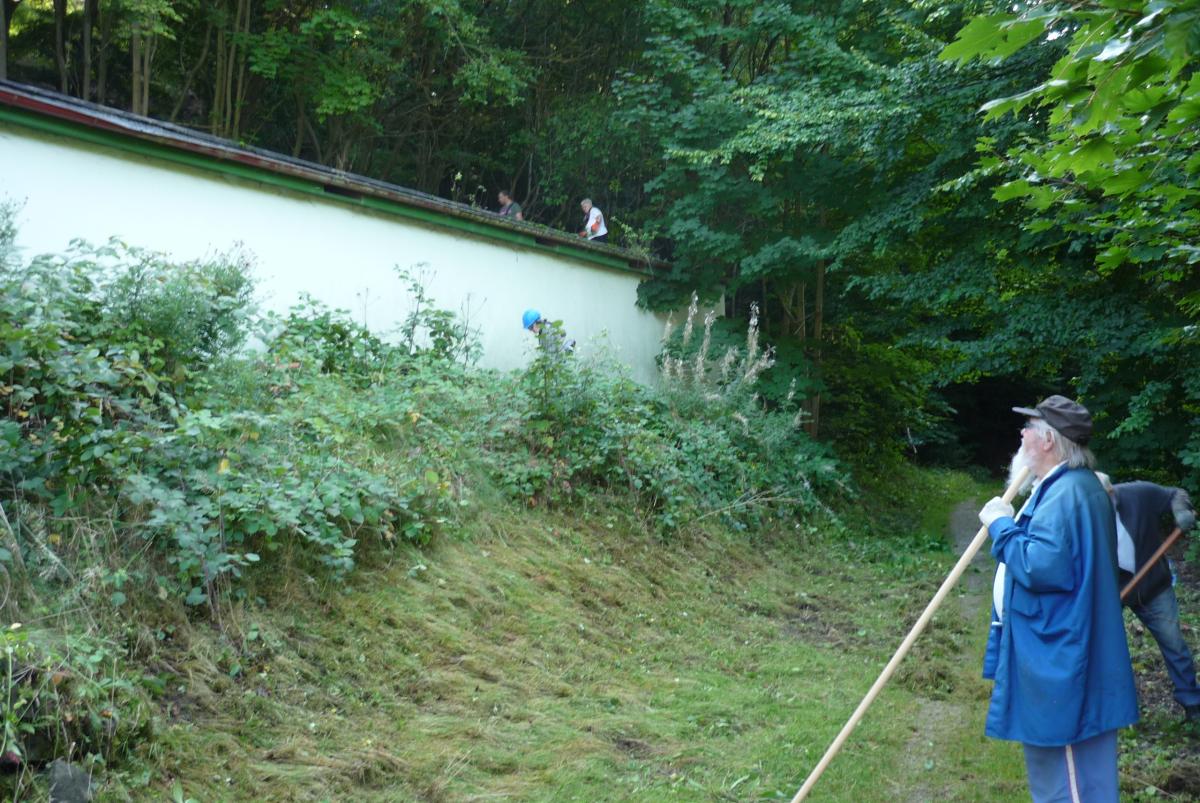 Die Helfer befassten sich mit den Außenanlagen. Sträucher und sonstiges Strauchwerk vor dem Haus wurde zurückgeschnitten oder entfernt. Andere Helfer säuberten das Flachdach der ehemaligenSchießanlage und das oberhalb des Flachdaches gelegenen Hang. Es war keine einfache Arbeit und schweißtreibend hinzu zumal an diesem Tage das Außenthermometer die 20 Grad-Marke weit überschritt.