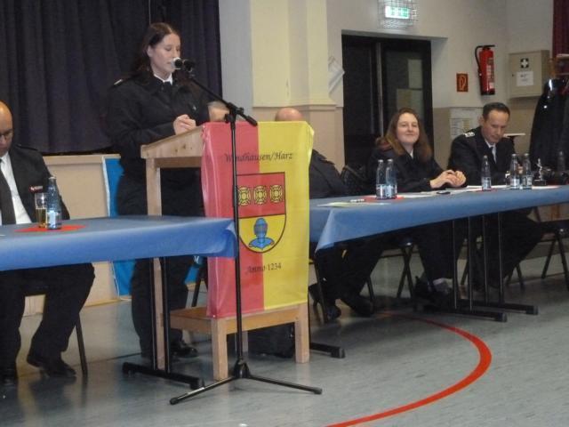 Gemeindejugendfeuerwehrwartin Kristin Rosenthal-Becker betrachtete rückblickend ein erfolgreiches Jahr der Jugendwehren. Auch aus ihrer Sicht war das Sommerzeltlager ein besonderer Höhepunkt. Am 27. Juni 2026 werden die Jugendwettkämpfe der Stadt Osterode am Harz und der Gemeinde Bad Grund in Gittelde ausgetragen. Sie dankte mit einer Packung Süßigkeiten.