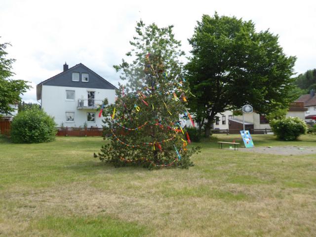 Bad Grund (kip) Um einen schmucken Johannisbaum, der erst am Tag zuvor von vielen eifrigen Ehrenamtlichen auf dem St. Antoniusplatz zwischen der mächtigen Kirche und dem ehrwürdigen „Alten Rathaus“ aufgestellt ist, wurde sehr schön geschmückt. Der Johannibaum wird für einige Zeit neben dem Zwergenbrunnen „König Hübich“ ein begehrtes Fotoobjekt sein.