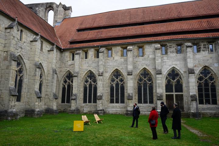 Tobias Henkel (Direktor der Stiftung Braunschweigischer Kulturbesitz), Dorothea Spielmann-Meyns, Micha Schmidt (studio komplementaer) und Landesbischof Dr. Christoph Meyns bei einer Station des spirituellen Klosterrundgangs im Kreuzgarten.