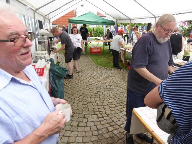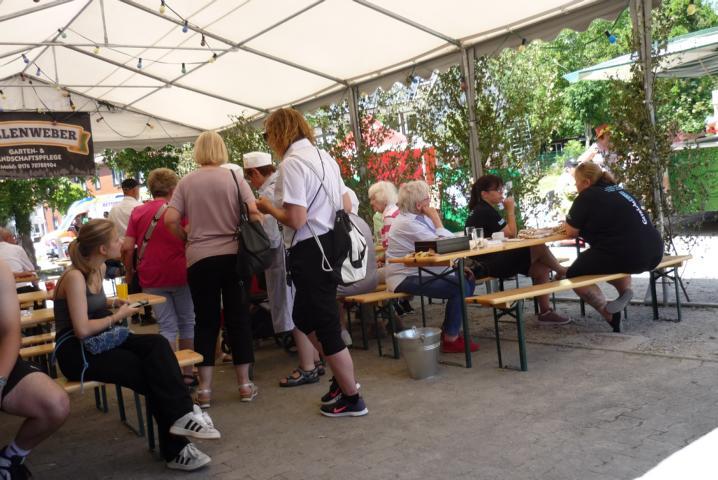 Das Team um Petra de Vries hielt ein umfangreiches Kuchenbufett mit duftendem Kaffee bereit. Viele nutzten die Sitzgelegenheit mit Tischen unter dem großen Partyzelt im Schatten der Dorfgemeinschaftsanlage.