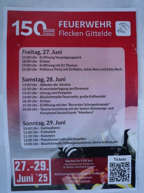 Gittelde (kip) Die Freiwillige Feuerwehr Gittelde feiert ihr 150-jähriges Bestehen. Zu diesem Jubiläumsfest lädt die Feuerwehr zu einem Zeltfest auf dem Schützenplatz vom 27. Juni bis Sonntag, 29. Juni, ein.