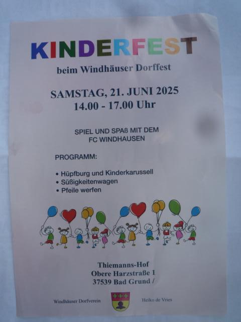 Windhausen (kip) Am Samstag, 21. Juni 2025, 14 Uhr, beginnt auf Thiemans Hof im Rahmen des Dorffestes das Kinderfest. Unter dem Motto „Spiel und Spaß mit dem FC Windhausen“ lädt der Windhäuser Dorfverein ein. Das Programm sieht vor: Hüpfburg und Kinderkarussell, Süßigkeitenwagen und Pfeile werfen. Bis 17 Uhr wird ein abwechslungsreiches Programm geboten.